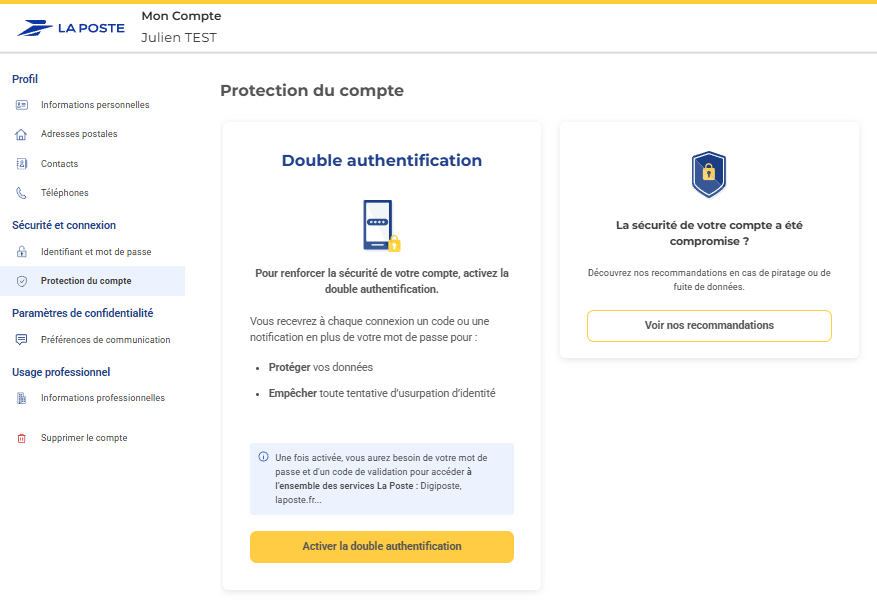 Une fois connecté à votre Compte La Poste, cliquez en haut à droite sur vos initiales, puis sur « Gérer mon Compte La Poste ».Depuis la rubrique « Sécurité et connexion > Protection du compte », cliquez sur « Activez la double authentification ».